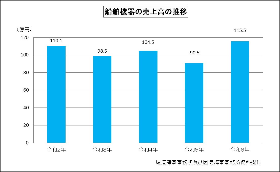 (1)尾道市の舶用工業における令和6年の生産高は、115.5億円です。