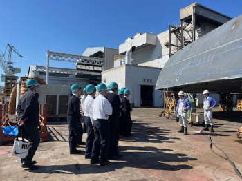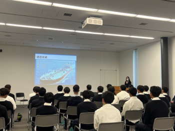 尾道高等学校工学科の1年生28名が、尾道造船株式会社で行われた造船所見学会に参加しました。最初に中国運輸局と尾道造船株式会社の職員さんによる「造船・舶用工業の現状」「尾道造船について、働く上で大切なこと」と題した講義があり、身近にありながらも詳しく知らない船について学びを深めました。 講義の後は実際に進水式を見学し、大きな船が海に滑り降りていく迫力満点の光景に圧倒されていました。実際に現場で働いている若手職員さんとの懇談の時間もあり、生徒の皆さんはそれぞれ疑問に思っていたことを質問するなど、普段は聞けない現場のエピソードに耳を傾けていました。