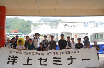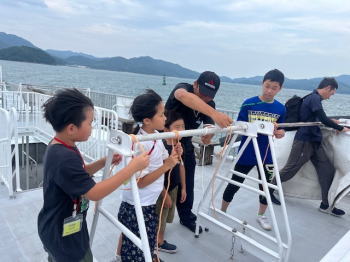 市内の小中学生及びその保護者の合計25人が参加し、旅客船「CYCLESHIP LAZULI」に乗って、学芸員による解説で尾道と尾道港の歴史について理解を深めつつ、今回は大三島へ向かいました。尾道の箱庭的都市や造船所にドック入りしているたくさんの大型船、国の重要文化財として指定された大浜埼灯台など、普段見ることのできない景色を眺めながらの航海です。大三島では武功や海上交通の安全を守る神として、村上海賊からも信仰を集めた大山衹神社を参拝し、宝物館を見学しました。帰りの船上では、ロープワークや船長室を見学させていただき、オープンデッキで風や景色を楽しみました。