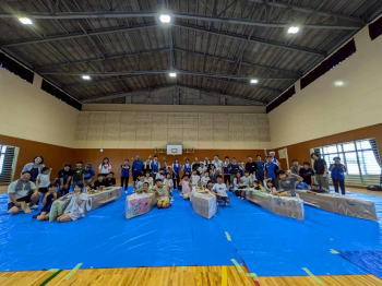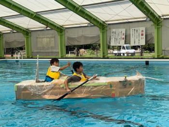 小学4~6年生とその保護者や兄弟など、44人が参加し、段ボールで船を作って乗船体験を行いました。 まずは、元船員の方による「内航船員のお仕事紹介」が行われ、船員さんの仕事や生活の魅力について理解を深めました。続いて5つのグループに分かれて段ボールボート作りです。 段ボールを切ったり貼ったりしながら、スタッフや仲間と協力して二人乗りの大きなボートを制作しました。子どもだけでなく保護者も真剣に取り組み、個性あふれる5艘の船が完成しました。完成した船は、プールに浮かべて実際に乗船体験です。船が無事に浮かんだときには、参加者全員から歓声が上がりました。 最初は恐る恐る乗っていた子ども達も何度も挑戦するうちにオールさばきが上達し、ぐんぐんと進みます。 船が転覆してプールに落ちてしまっても、子ども達はとても楽しそうに乗船にチャレンジしていました。 会場は参加者の歓声と声援であふれ、大変盛り上がり楽しく体験しました。