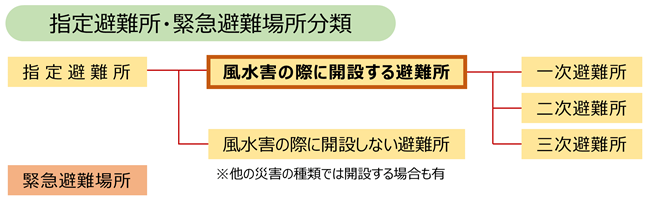 ➀:1次開設避難所‥‥風水害の危険がある際に、最初に開設する避難所