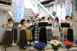 この日の朝は小雨だったため、今回は商店街の中で土堂小学校・尾道東高校の生徒児童による校歌の合唱、フルート演奏等がありました。